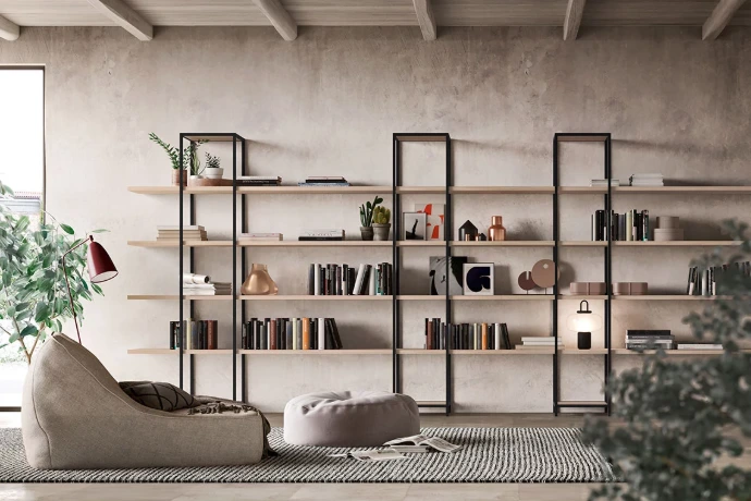 Deze modulaire boekenkast is een veelzijdig systeem dat bestaat uit een zwart geanodiseerd aluminium frame, waaraan legplanken, achterwanden, laden, ladekasten, deuren, plantenbakken, kussens en tv-compartimenten kunnen worden toegevoegd. Het systeem is volledig personaliseerbaar, waardoor elke boekenkast uniek en origineel is. Eén enkel product maakt uiteenlopende composities mogelijk: van een zitbank, tot een scheidende boekenkast midden in de ruimte, tot zelfs een plafondhoge boekenkast.