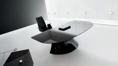 De Ola-directiebureaus worden gekenmerkt door de bijzondere vorm van de basis, uitgevoerd in een witte, gelakte “solid surface”-afwerking, en door de zachte lijnen van de bladen die verkrijgbaar zijn in notenhout, lakwerk, leder of glas.