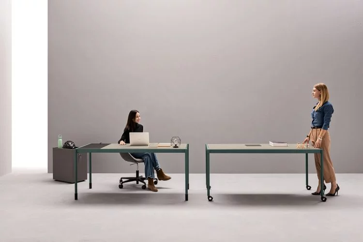 Agile is a managerial desk, bench and meeting tables system with simple and geometric lines enriched by the possibility of choosing between two top thickness, 14 or 30 mm, and by the variety of the leg finishes.