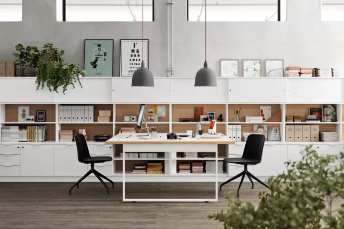 De centrale Spine-systemen bestaan uit een centraal modulair element waaraan bureaus haaks worden gekoppeld. Het belangrijkste voordeel van deze systemen is de grotere opbergcapaciteit en de zeer comfortabele toegang tot dossiers en archivering.
